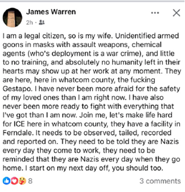 El DHS en un comunicado indicó que entre los incidentes recientes se incluye el arresto de Eduardo Aguilar en Dallas, Texas, por solicitar el asesinato de agentes de ICE en TikTok a cambio de $10,000 por cada oficial. Además, la esposa de un oficial en Texas recibió una llamada amenazante que aludía a las consecuencias para los nazis después de la Segunda Guerra Mundial, y se identificó una publicación en Facebook donde un individuo comparaba a los oficiales de ICE con «Nazis» y «La Gestapo» y amenazaba con acosar y grabar a empleados de una oficina en Washington.