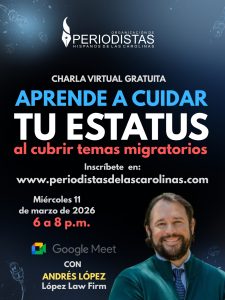 El evento está dirigido a periodistas, creadores de contenido y cualquier persona interesada en profundizar en los aspectos legales al cubrir temas migratorios. La participación es gratuita, pero el registro es obligatorio con cupos limitados. Para inscribirte, visita www.periodistasdelascarolinas.com y sigue las instrucciones llenado el formulario sencillo, luego recibirá del mismo correo de la organización un email con el link para que se conecte el día de la charla.