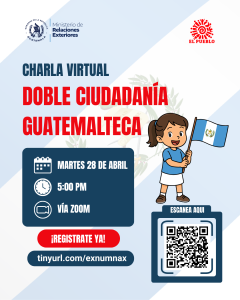 Raleigh, NC.- El martes 28 de abril, los padres guatemaltecos podrán conocer el proceso para tramitar la doble ciudadanía para sus hijos nacidos en los Estados Unidos. Esto será durante una charla informativa virtual en español que realizarán el Consulado General de Guatemala en Raleigh y la organización El Pueblo.